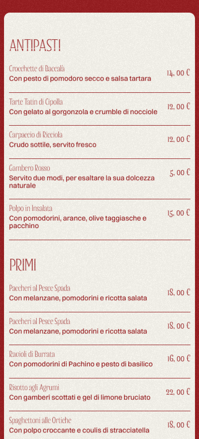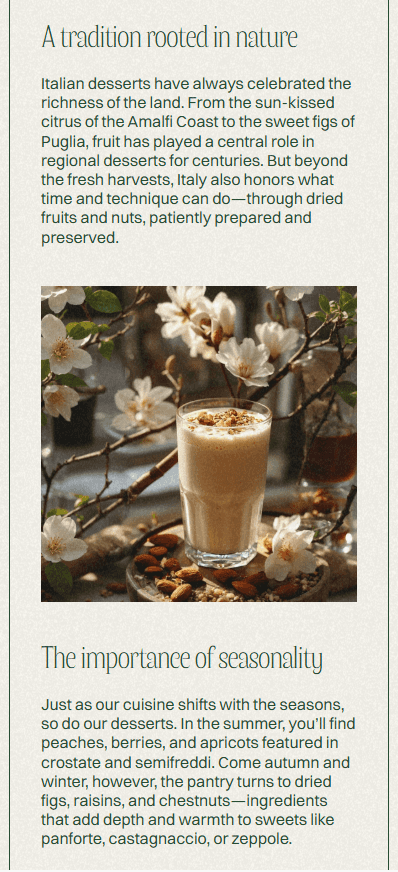 Our involvement spanned full photography, art direction, visual identity design, and website development, allowing us to shape every element of the brand from the ground up. The photography direction focused on texture, light, and materiality, capturing ingredients, table settings, and imagined dishes in a way that evokes warmth and intimacy. The visual identity drew inspiration from Italian craftsmanship, natural palettes, and understated typography.